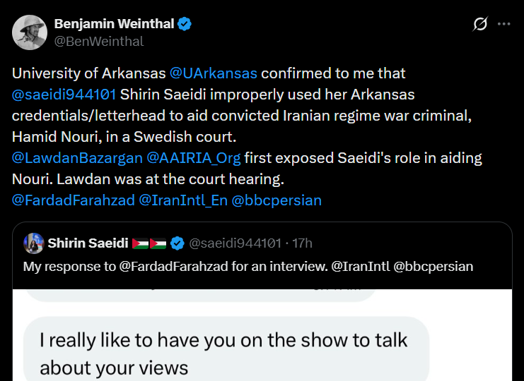Adding to the scandal, Reporter Benjamin Wienthal of Fox News Digital stated that the University of Arkansas had confirmed to him that Saeidi improperly utilized university credentials and official letterhead to provide support for Hamid Nouri during his criminal trial in Sweden. Nouri was convicted in July 2022 and sentenced to life imprisonment for his participation in the systematic execution of thousands of political prisoners in Iran’s notorious 1988 massacre, one of the worst human rights atrocities in modern Iranian history.