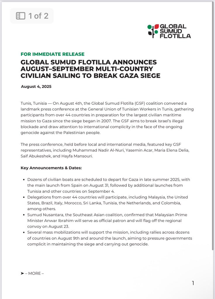 The Global Sumud Flotilla (GSF) is set to depart from Spain and Tunisia at the end of August and early September, with delegations from over 40 countries, including the U.S., Malaysia, Brazil, and Italy. It boasts as the largest civilian voyage to Gaza since 2007. While the flotilla presents itself as a peace mission, an investigation by Jewish Onliner has revealed that several members of the steering committee have met with officials from U.S.-designated terror groups like Hamas, Palestinian Islamic Jihad (PIJ), and The Popular Front for the Liberation of Palestine (PFLP), and have given money to Hamas-linked bodies in Gaza.