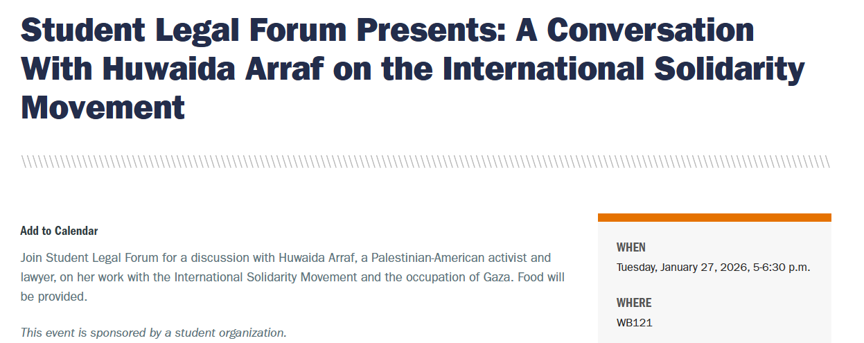 The event, sponsored by the Student Legal Forum—a group that seeks to introduce "notable persons" to the academic community—raises questions about the type of voices being elevated at one of America's premier legal institutions. Arraf's alleged associations with designated terror organizations, her published endorsement of violence, and her legal representation of individuals convicted in deadly terror attacks have made her a controversial figure.