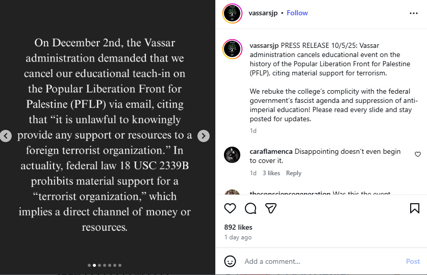 Vassar College administration shut down a Students for Justice in Palestine educational “teach-in” set to focus on the Popular Front for the Liberation of Palestine (PFLP), a US-designated terrorist organization. The cancellation, which occurred on December 2nd, sparked immediate backlash from SJP, who released a statement on December 6th, 2025, accusing the college of “suppressing” anti-imperial education and cooperating with what they called the federal government’s “fascist agenda.”