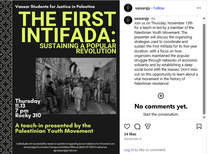In a separate November incident, Vassar SJP promoted a “teach-in” scheduled for November 13th, led by a member of the Palestinian Youth Movement. That event focused on the organizing strategies from the First Intifada (1987-1993), a violent Palestinian uprising in which over 200 Israelis were murdered. The group described it as learning about “a vital movement in the history of Palestinian resistance.”