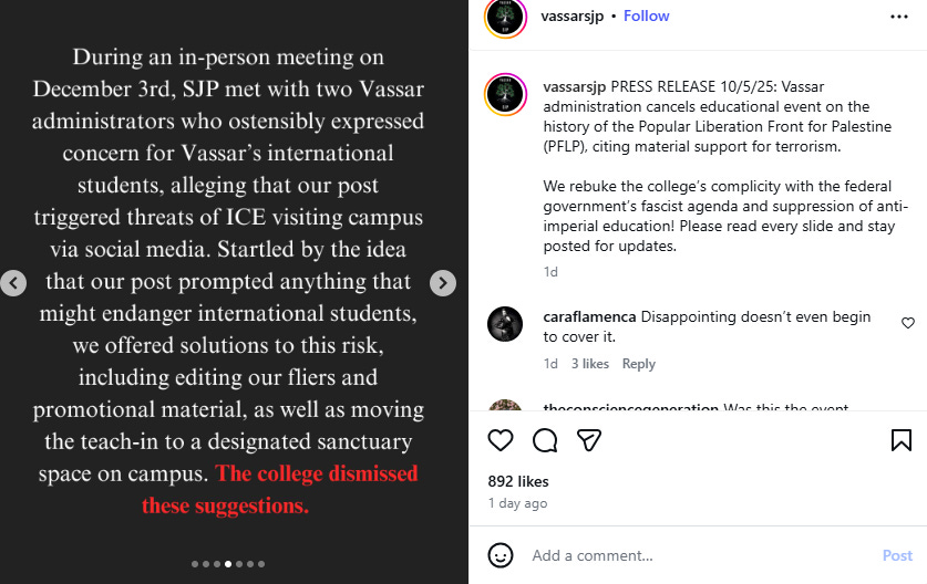 The group claimed that during an in-person meeting on December 3rd, two Vassar administrators expressed concern about international students, “alleging that our post triggered threats of ICE visiting campus via social media.” SJP said they offered to edit promotional materials and move the event to a designated sanctuary space, but “the college dismissed these suggestions.”