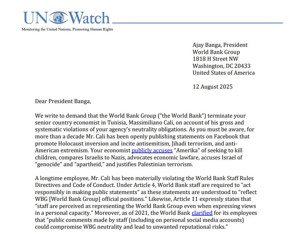 UN Watch demands that the World Bank Group terminate its senior country economist in Tunisia, Massimiliano Cali, on the basis of his systematic violations of the institution's neutrality obligations