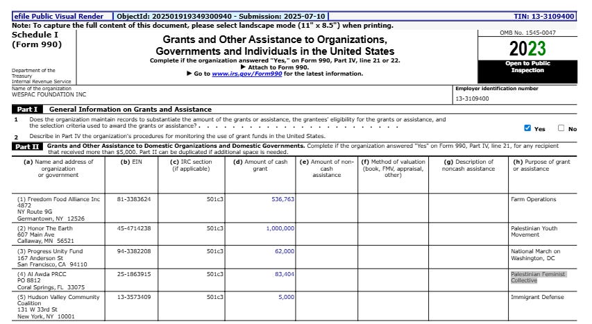 The filing marks a departure from previous years, with WESPAC for the first time publicly naming the fiscally sponsored projects it supports. Previously, such funding was buried under vague budget categories like “office expenses,” making it nearly impossible to track where donor money ultimately flowed.