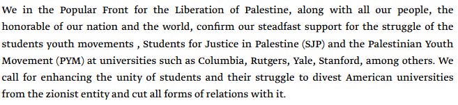 Following October 7, PYM mobilized demonstrations and helped coordinate student encampments across North America. In spring 2024, the PFLP itself issued a statement explicitly expressing support for PYM’s activities on American campuses.