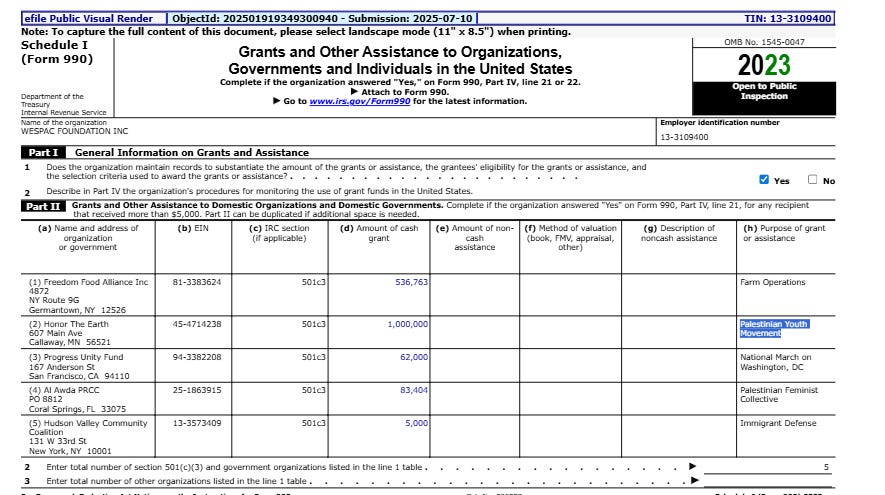 The most significant revelation centers on a $1 million grant to Honor the Earth, listed in the filing with the grant purpose ‘Palestinian Youth Movement.’” PYM has alleged ties to the Popular Front for the Liberation of Palestine (PFLP), a U.S.-designated terrorist organization.
