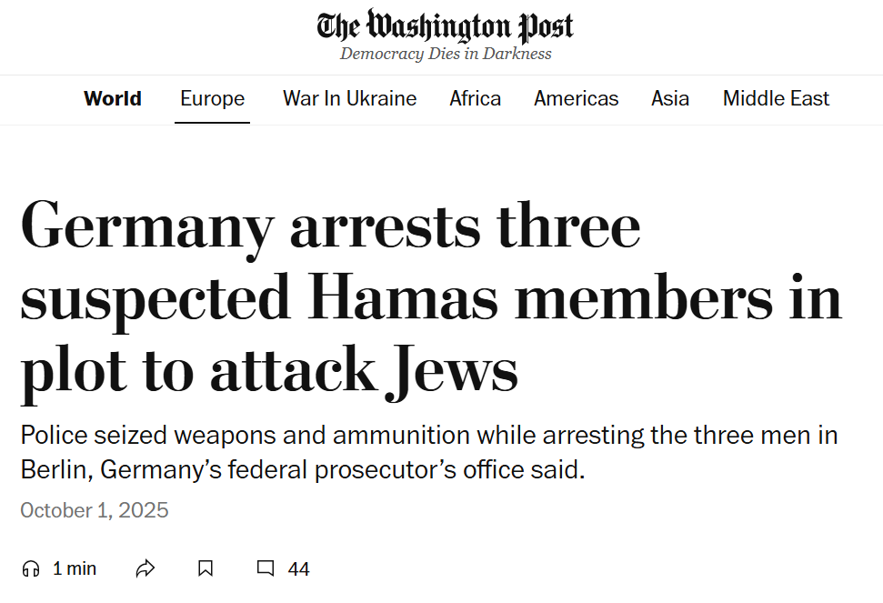 “Recruiting experienced criminals is part of Hamas’ new strategy,” German security officials stated following arrests in October 2025, when three suspects were detained on the eve of Yom Kippur with an AK-47, Glock pistol, and ammunition intended for attacks on Jewish institutions.