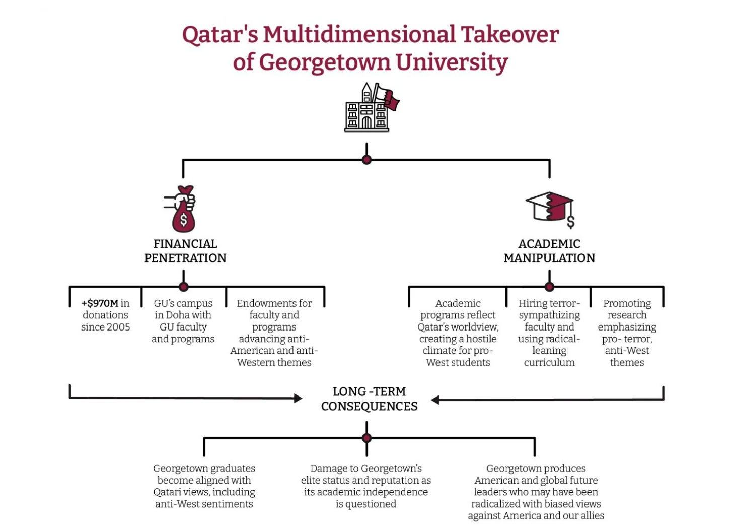 The report reveals how Georgetown’s Qatar partnership functions as part of a broader soft-power strategy—leveraging large-scale education funding, access to governance structures, and interconnected programming ecosystems to shape priorities within an elite U.S. institution. While acknowledging Georgetown’s stated contractual control over academic operations at GU‑Q, the report contends that the funding architecture and institutional integration create systemic risks to academic independence.