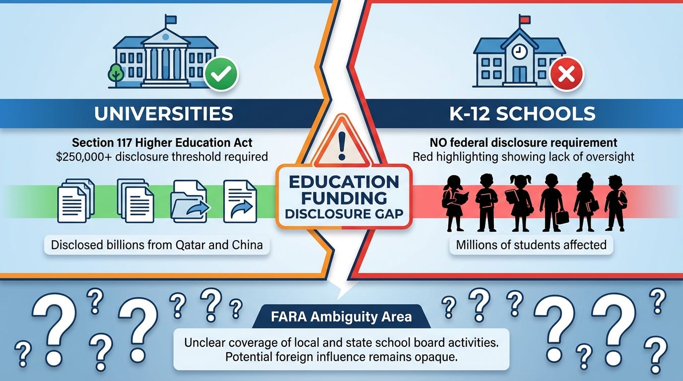 While universities operate under Section 117 of the Higher Education Act, which requires disclosure of foreign gifts exceeding $250,000, K-12 schools and school districts face no equivalent obligation.