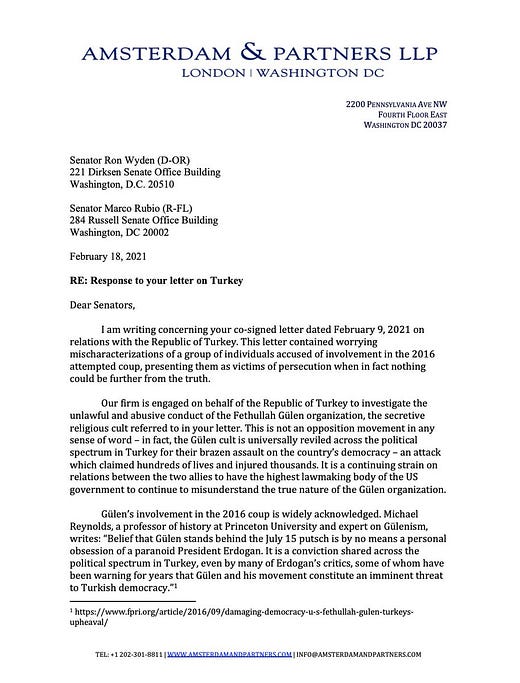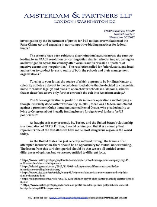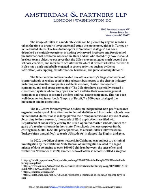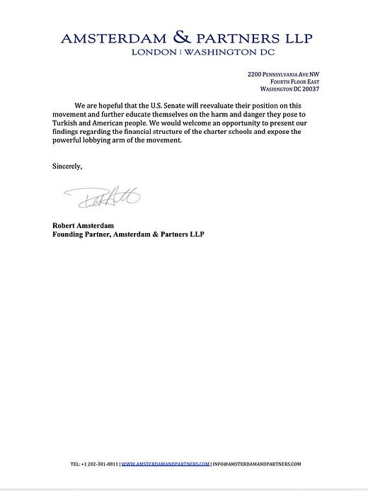 Between 2015 and 2018, the Washington-based law firm Amsterdam & Partners LLP appears to have conducted a coordinated campaign across multiple states on behalf of the Turkish government, the Jewish Onliner has learned. Registered under the Foreign Agents Registration Act as #6325, the firm received at least $1.8 million from Ankara to target approximately 160 American charter schools with alleged ties to exiled Turkish cleric Fethullah Gülen.