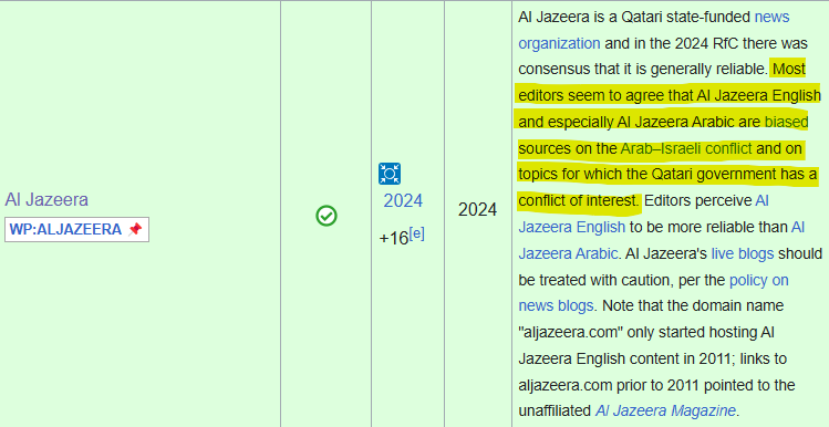 1. Al Jazeera (Qatar): With 20,217 citations and a “Generally Reliable” ranking on Wikipedia’s reliability list, Al Jazeera’s massive citation count becomes problematic when examining its documented biases. The Anti-Defamation League’s 2025 report found clear evidence of coordinated campaigns on Wikipedia that frequently cite Al Jazeera to introduce anti-Israel narratives. Even Wikipedia’s own guidelines acknowledge that “most editors seem to agree that Al Jazeera English and especially Al Jazeera Arabic are biased sources on the Arab–Israeli conflict.”
