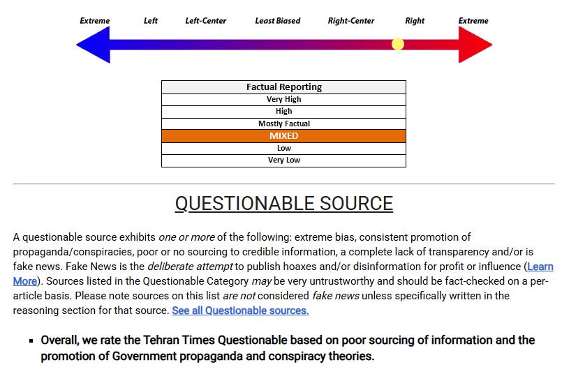 6. Mehr News (Iran): While it has 939 citations, Mehr News does not appear on Wikipedia’s reliability list. Mehr News Agency is a semi-official Iranian news agency sponsored by the government of Iran and owned by the Iranian government’s Islamic Development Organization (IIDO). Despite not appearing on Wikipedia’s reliability list, the outlet serves as what Ukraine’s Center for Countering Disinformation describes as “a state resource, reflecting the government’s stance on international issues” and a key component of Iran’s propaganda apparatus.