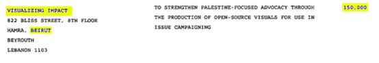 Tax filings from the George Soros Open Society Foundations, which donated over $200,000 to the organization between 2015 and 2018, explicitly listed a Beirut address for Visualizing Palestine’s parent entity.