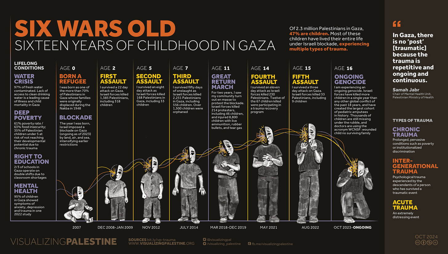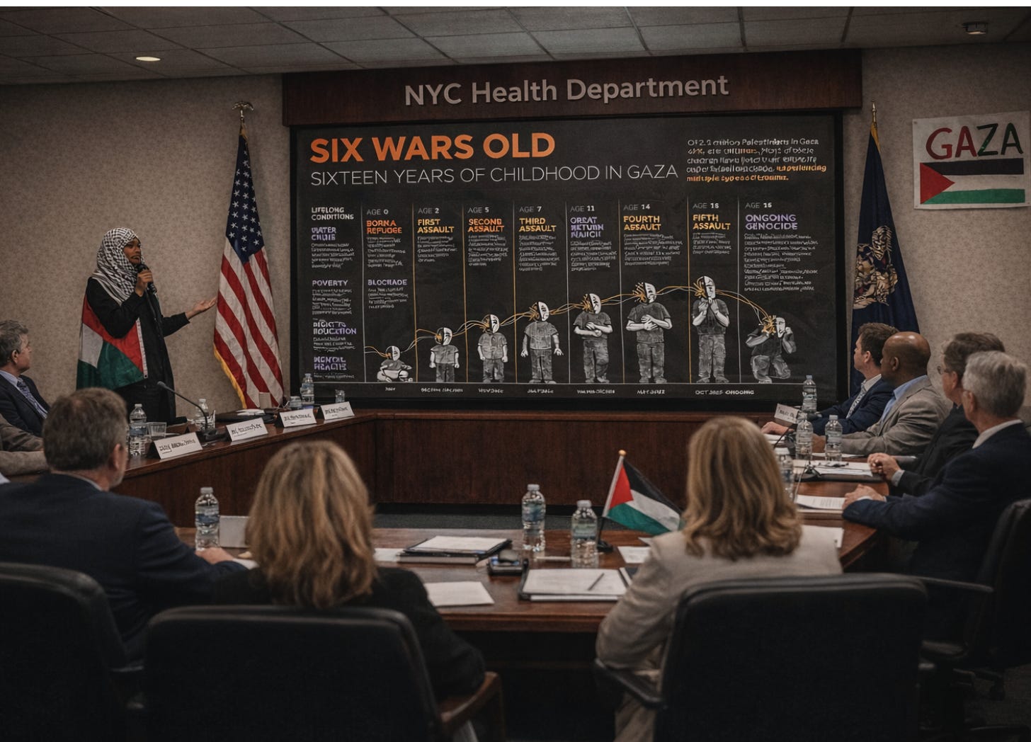 The meeting, held at the DOH headquarters in Long Island City during working hours and attended by staff both in-person and remotely, featured a presentation including graphics titled “Six Wars Old: Sixteen Years of Childhood in Gaza,” credited to Visualizing Palestine.