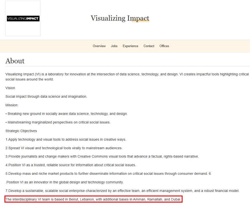 The parent organization, Visualizing Impact, maintains staff in Beirut, Amman, Ramallah, and Dubai, with staff listings describing the organization’s primary base as Beirut.